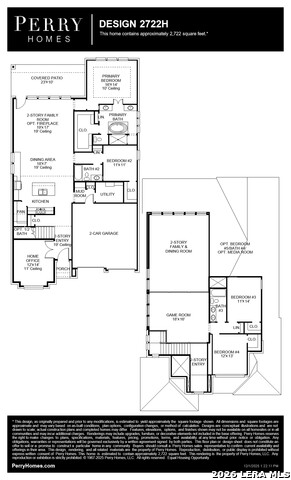 Home office with French doors set at two-story entry. Open kitchen offers deep walk-in pantry, 5-burner gas cooktop and generous island with built-in seating space. Dining area opens to two-story family room with wall of windows. Primary suite with 10-foot ceiling. Dual vanities, garden tub, separate glass-enclosed shower and large walk-in closet in primary bath. A second bedroom is downstairs. A game room and secondary bedrooms are upstairs. Covered backyard patio. Mud room off two-car garage.